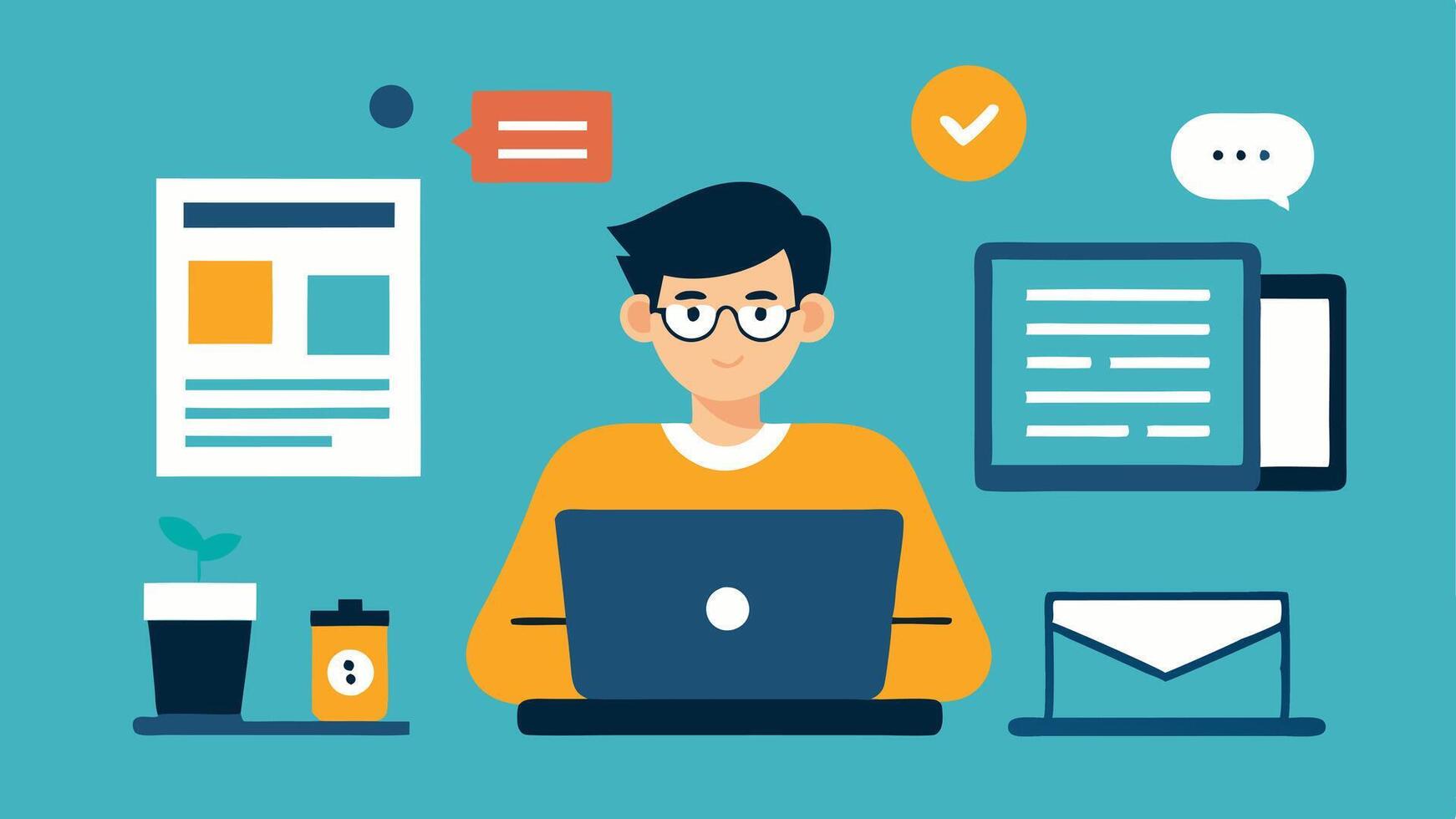 Writing for a Blog A writer tapping away on a laptop with a blog layout visible on the screen and various digital devices like a tablet and smartphone nearby.. Pro Vector
