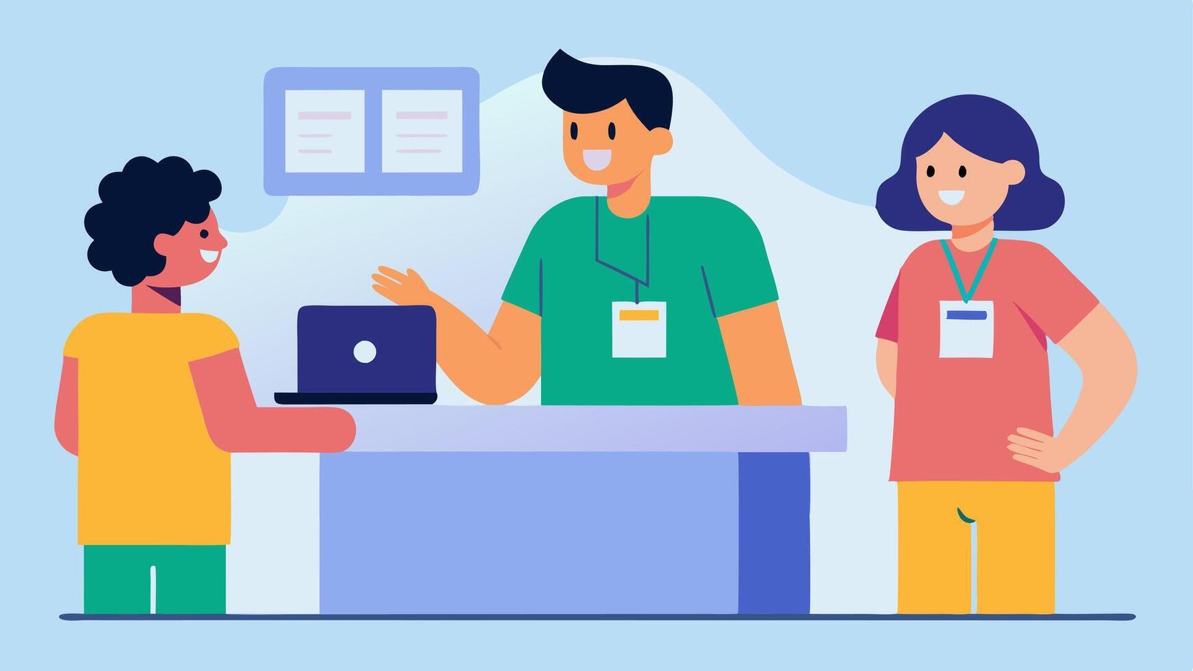 Registration Counter A friendly staff member at a registration desk checking in attendees with name badges and providing event programs to excited gamers.. Pro Vector