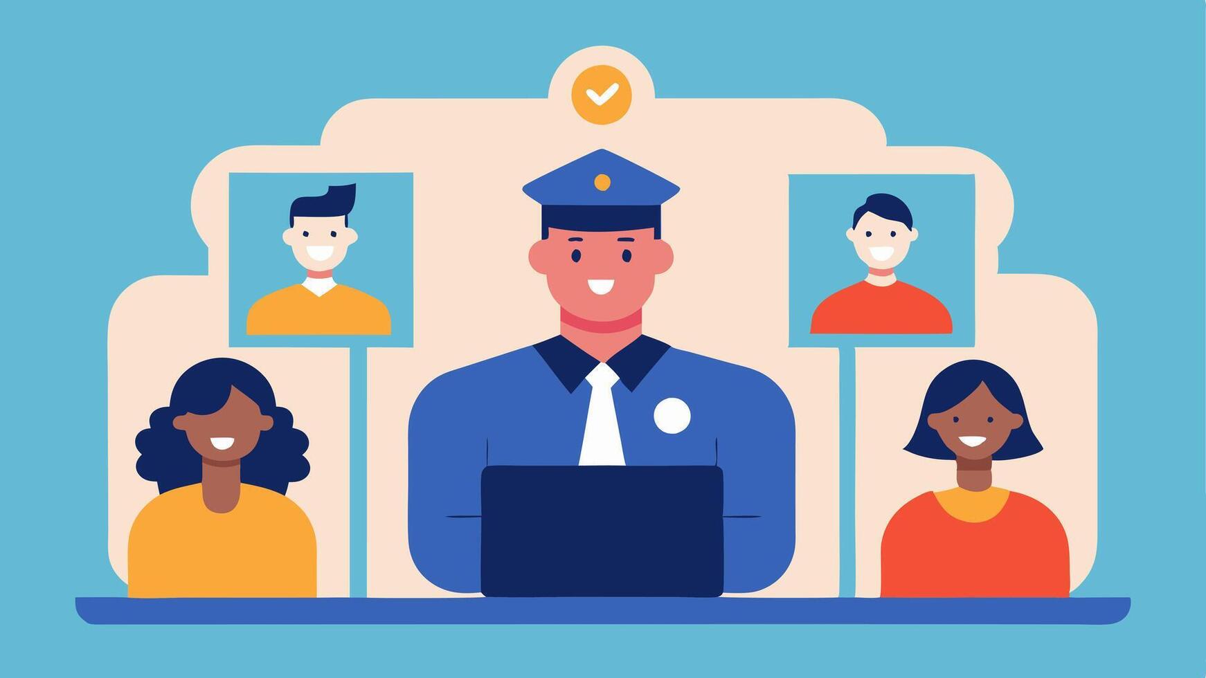 Virtual Meeting An Officer participating in a call discussing compliance issues with colleagues on the screen suggesting collaboration in remote work environments.. Pro Vector