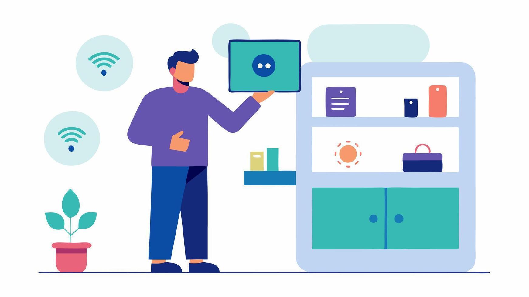 Setting Up a Smart Display A technician places a smart display on a shelf showcasing a range of smart home features while explaining functionalities to the homeowner.. Pro Vector