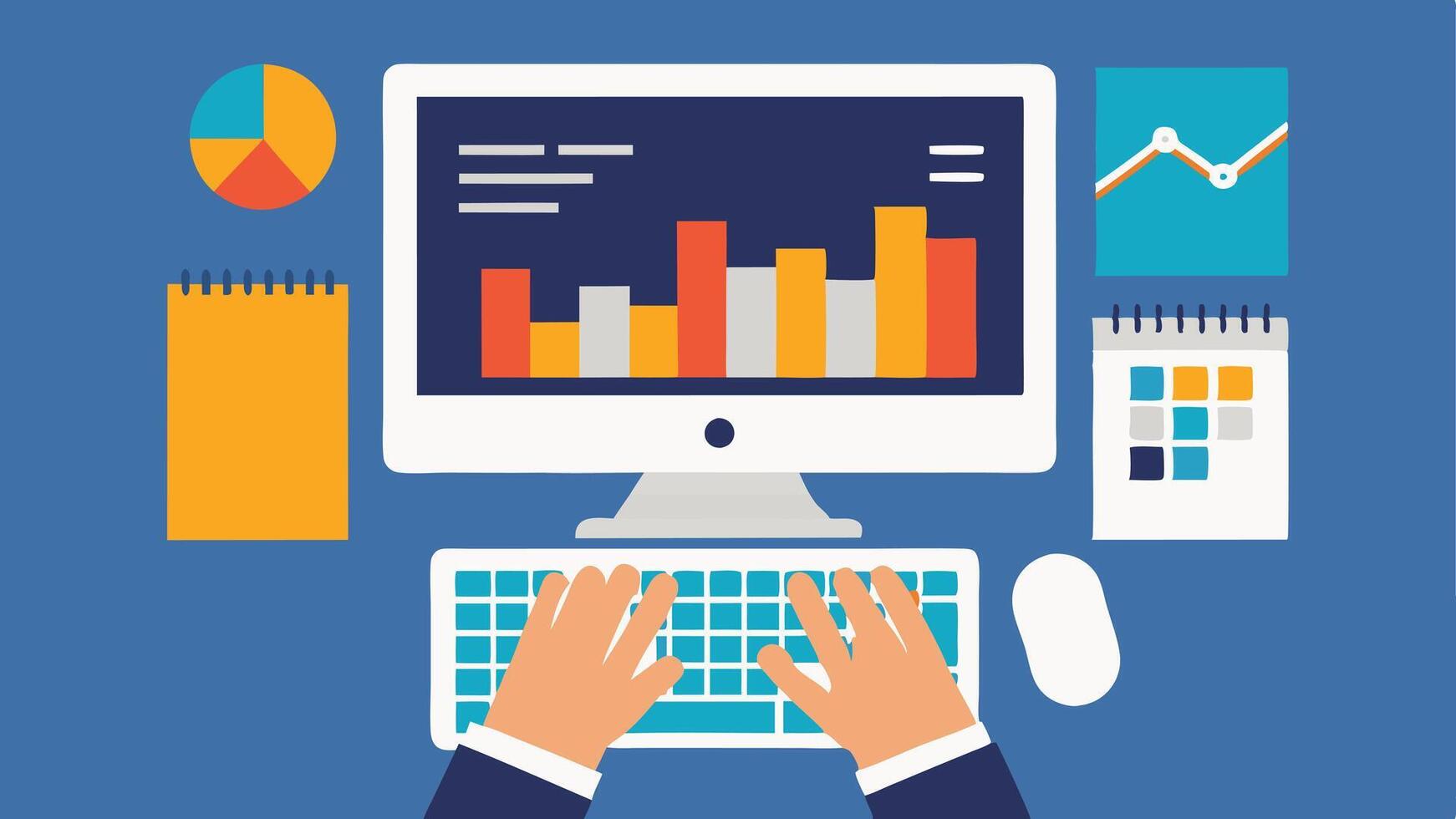 Statistical Analysis A closeup of an analysts hands on the keyboard running statistical software with data visualizations on the screen that relate to healthcare trends.. Pro Vector