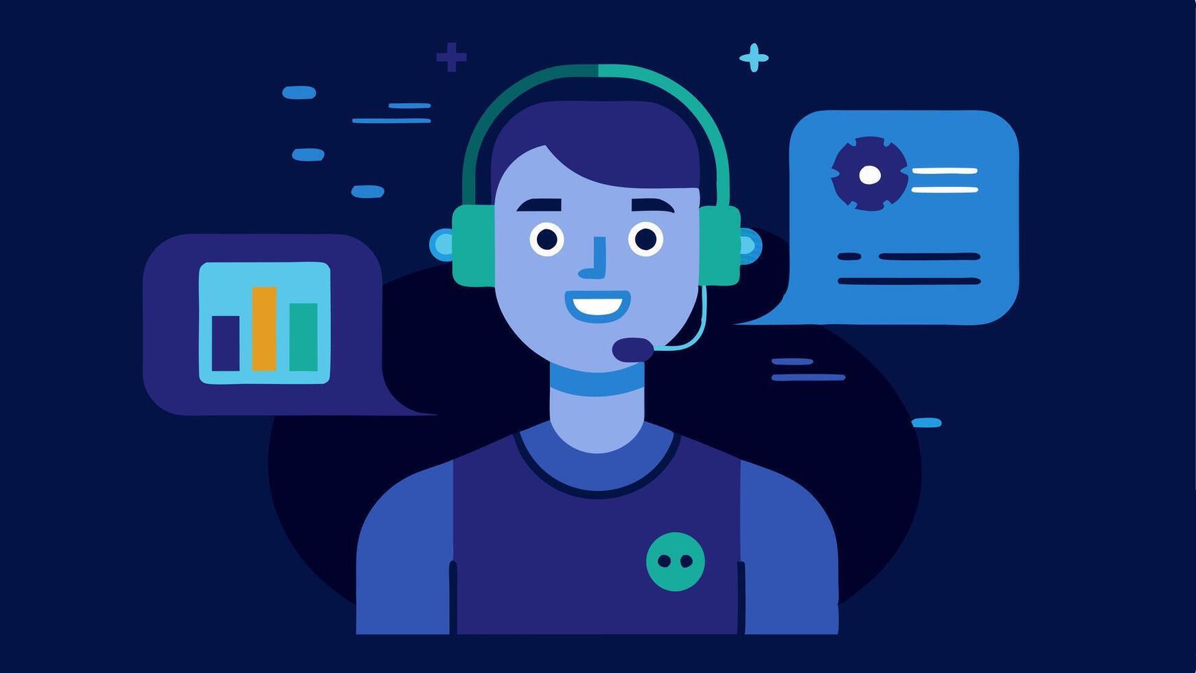 Voice Assistant Interaction A professional wearing a headset speaking to a digital voice assistant while a holographic interface displays customer queries and AI responses.. Pro Vector