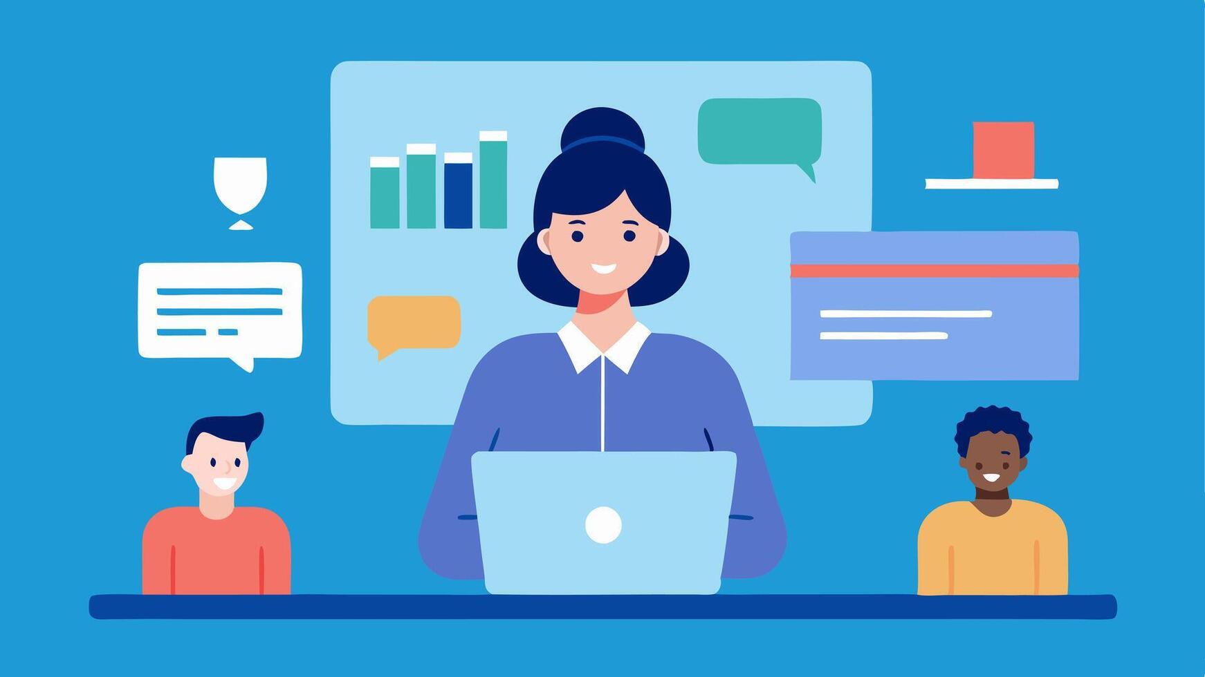 Webinar Training An individual conducting an online training session with a laptop showing attendees on a call and presentation slides on Ecommerce strategies.. Pro Vector