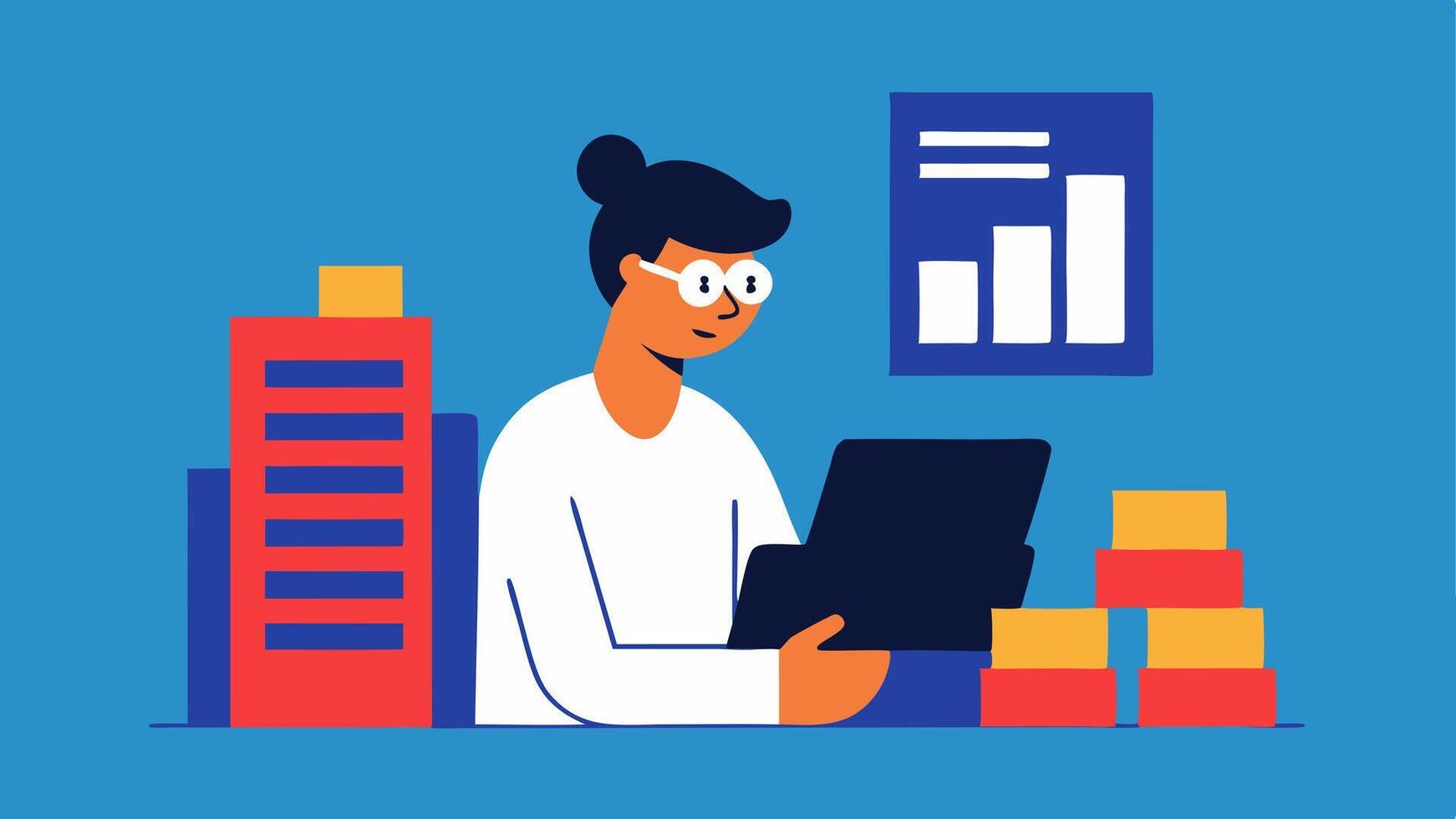 Statistical Analysis A data scientist using a calculator and a stack of reports filled with data illustrating the quantitative aspect of their work.. Pro Vector