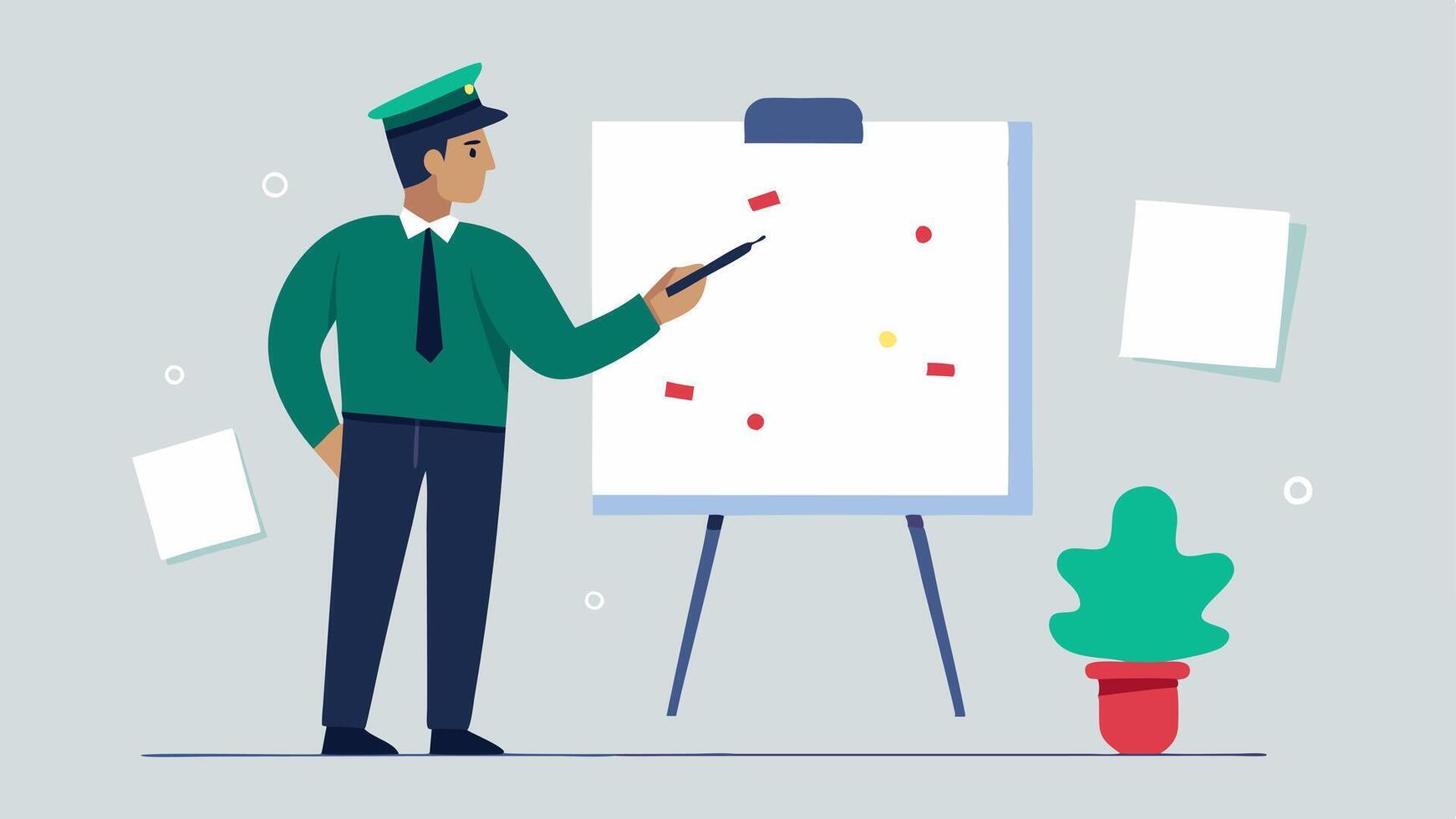 Whiteboard Brainstorming The officer standing before a whiteboard covered in sketches of the crime scene writing down observations in a notebook.. Pro Vector
