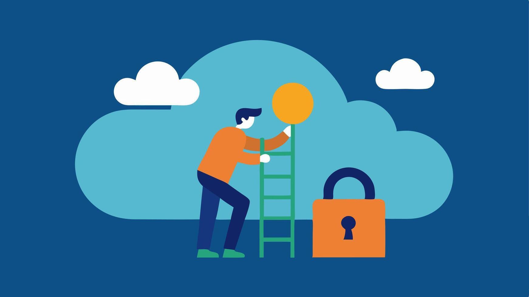 Security Measures An engineer installs a virtual lock icon onto a cloud emphasizing their role in securing cloud infrastructure with protective measures.. Pro Vector
