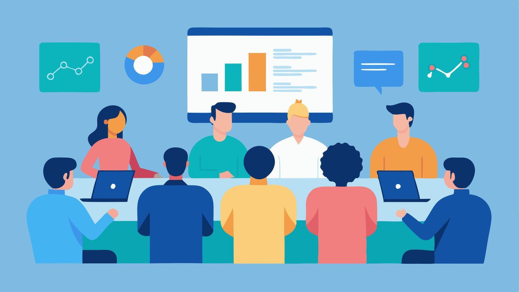 Team Collaboration A diverse group of professionals sitting around a conference table discussing a large screen displaying customer service analytics and AI insights.. Pro Vector