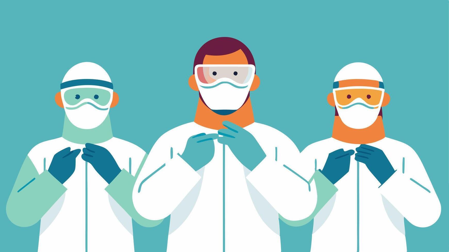 Safety Procedures Pathologists putting on face shields and masks as part of their safety protocols before starting the autopsy.. Pro Vector