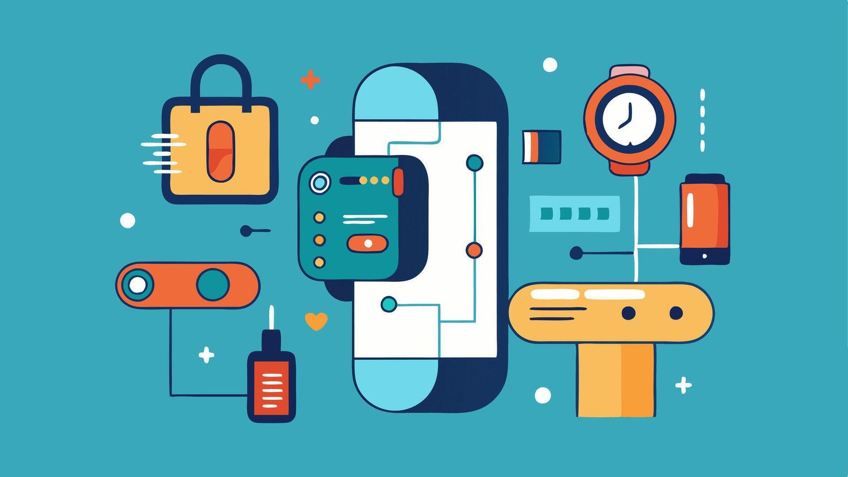 Schematic Design A technical illustration of a wearable devices internal components on a developers desk with schematics and annotations for each part.. Pro Vector