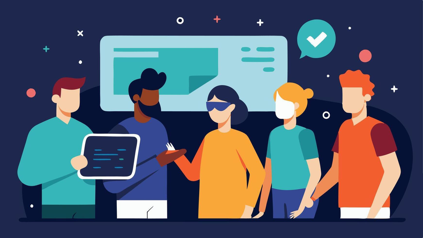 Team Collaboration A small group of developers collaborates around a tablet with one person demonstrating an AR app while others watch captivated by the visuals.. Pro Vector