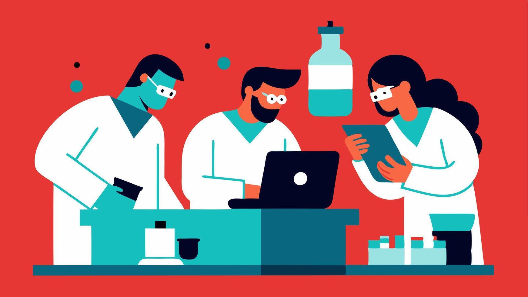Team Collaboration A group of scientists collaborating at a workstation reviewing samples and discussing findings related to gunshot residue.. Pro Vector