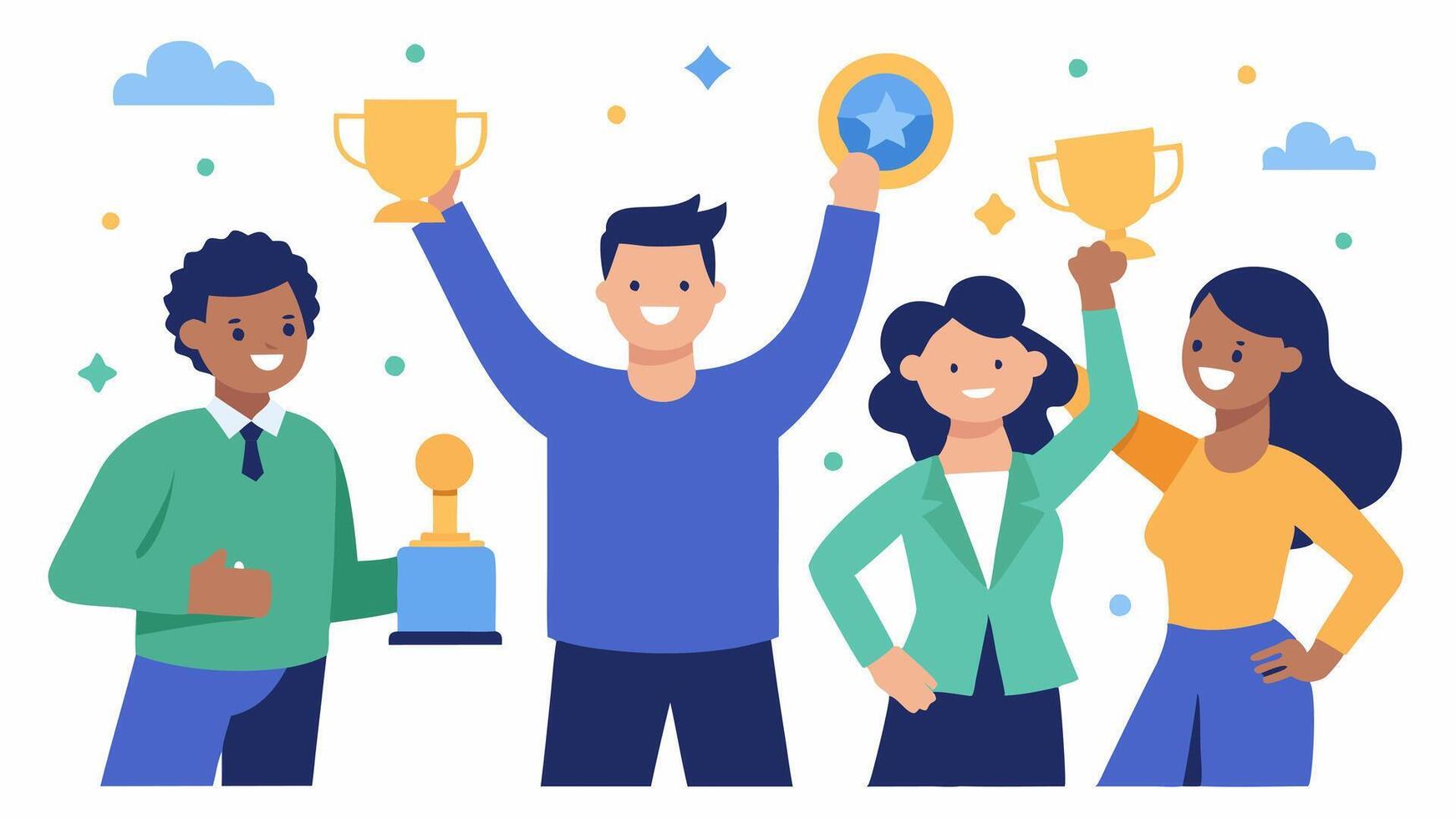 Success Celebration A cheerful scene of a consultant and a company team celebrating the successful implementation of a social impact project with trophies and certificates for. Pro Vector