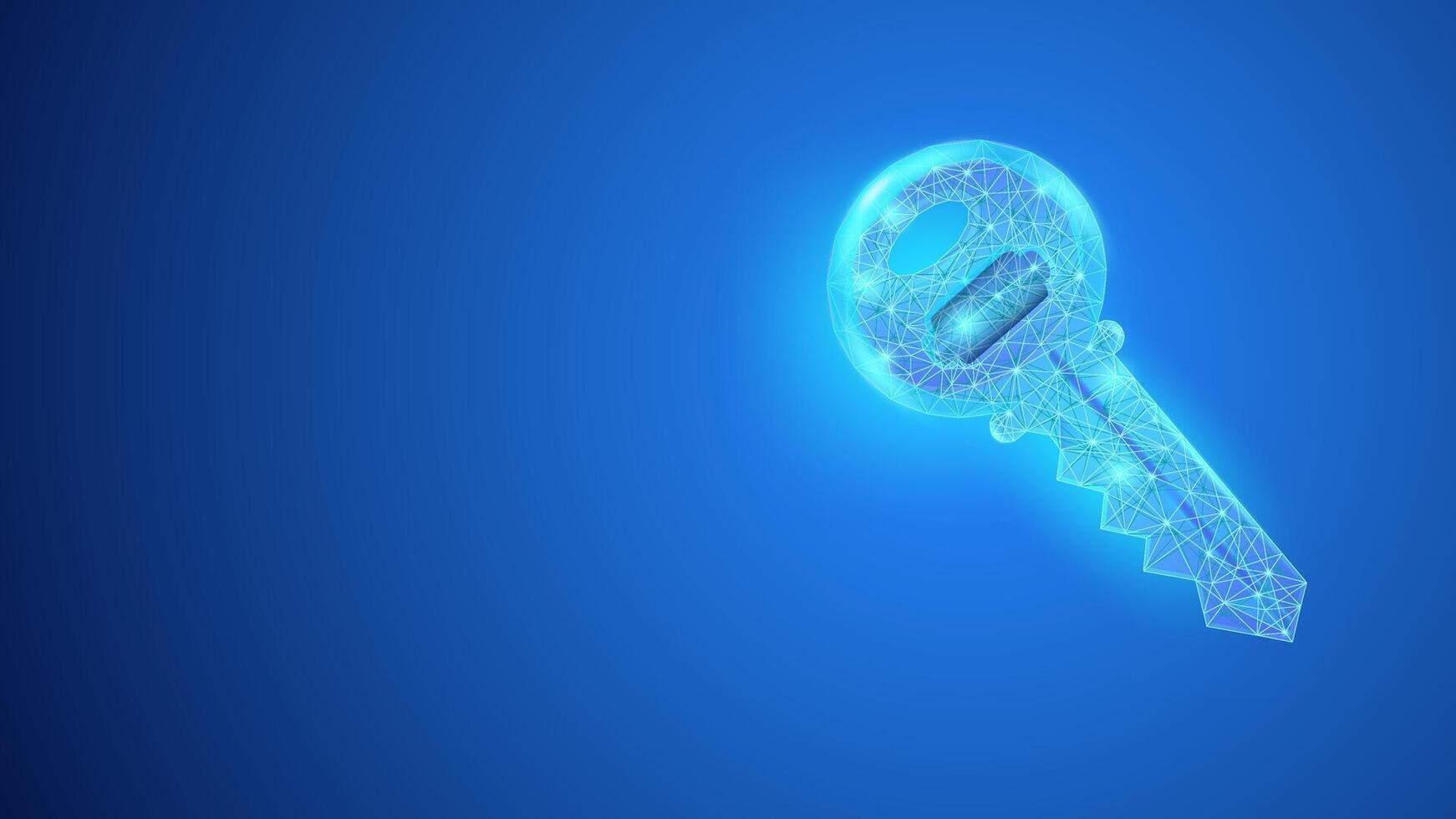 Digital key in glowing wireframe style, virtual key illustration for presentation templates, cyber security concept, user data security, and account password. Pro Vector