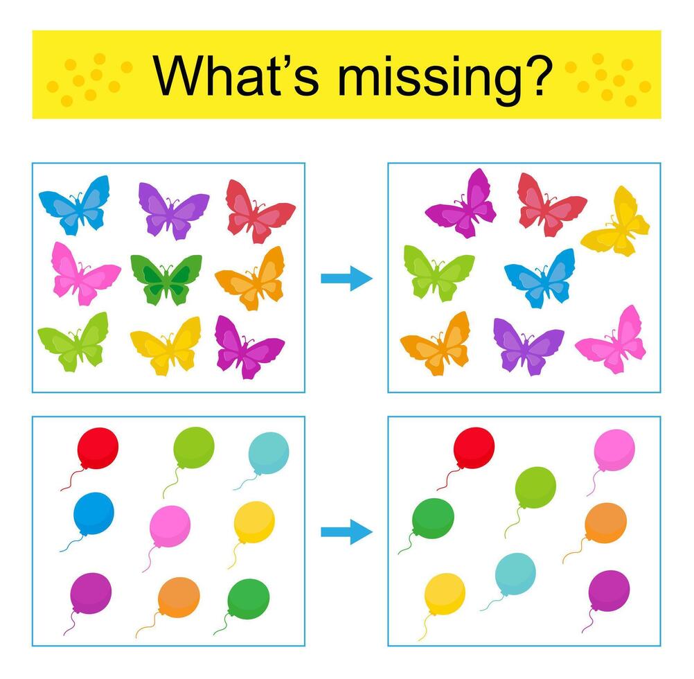 Puzzle game for kids. Task for the development of attention and logic. Find the missing balloon and, butterfly. Pro Vector
