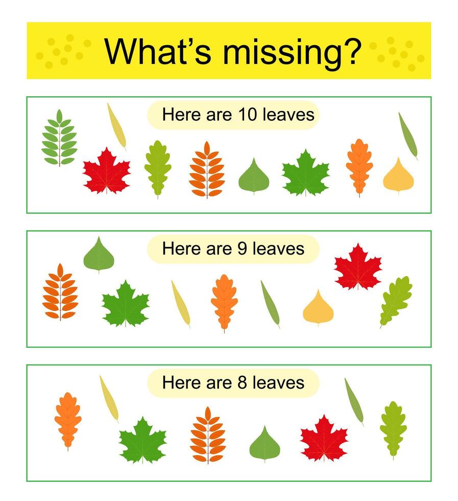 Puzzle game for kids. Task for the development of attention and logic. Find the missing leaves. Pro Vector
