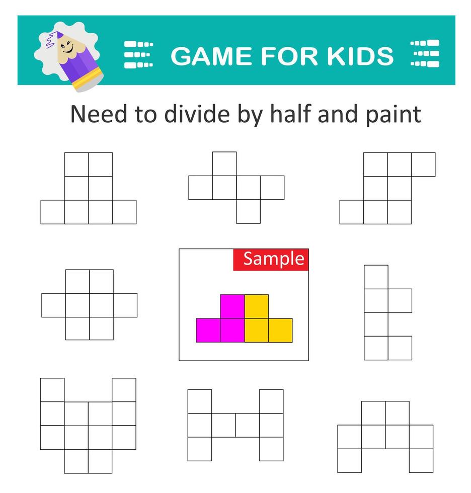 Logical puzzle game. Attention tasks for children. Need to divide by half and paint Pro Vector