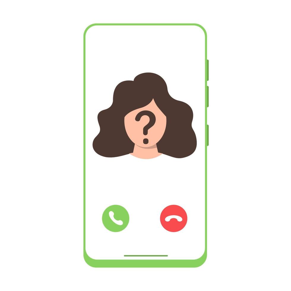 A smartphone screen displays an incoming call from an unidentified caller, featuring a question mark over a user's outline and green decline and accept buttons below Pro Vector