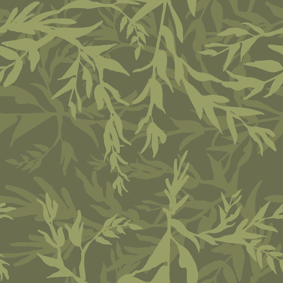 Camouflage plant leaves, hand drawn seamless pattern. Ink texture with tree branches. Camo with twig. Khaki green grunge drawing pattern. Botanical textile, wrapping paper Pro Vector