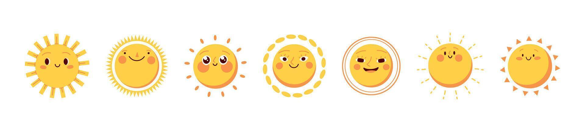 Sunshine character with a funny face in a groovy cartoon style. Set of summer stickers and patches for playful designs. Pro Vector