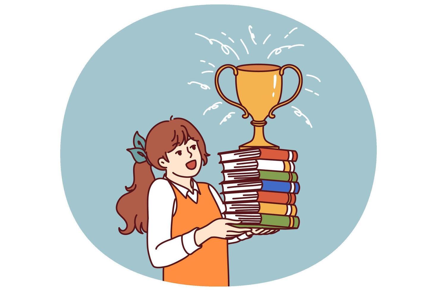 Schoolgirl with books and cup for winning olympiad rejoices at good marks for test Pro Vector