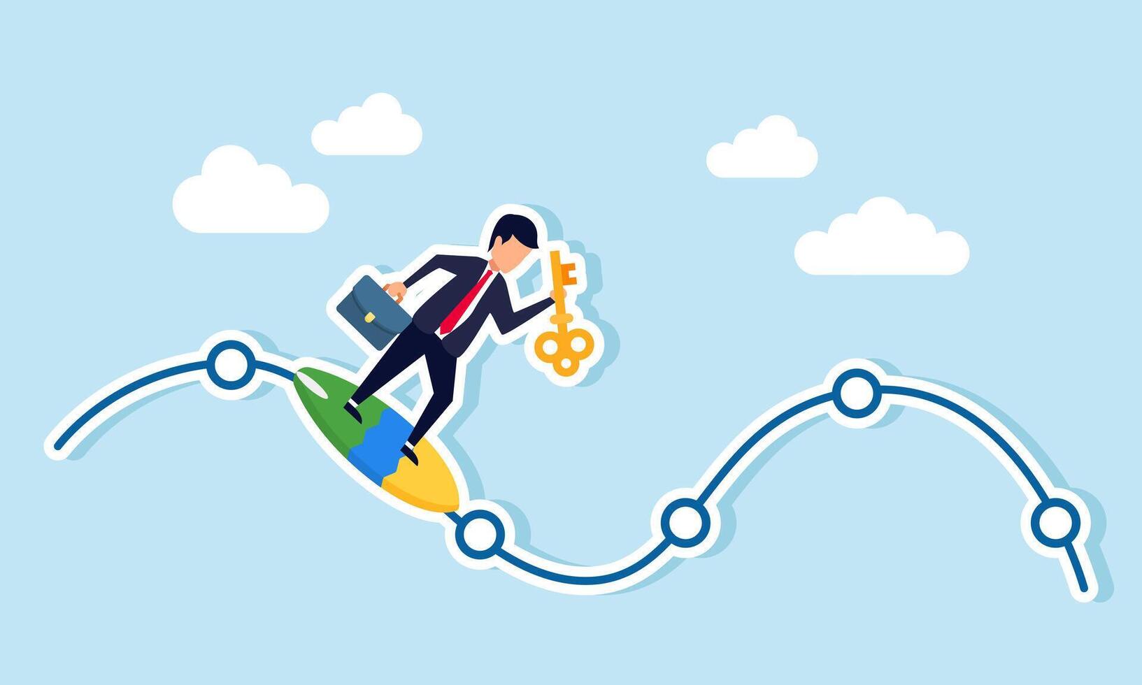 A businessman carrying a key while riding a surfboard gliding along a line, illustration of making the right decisions in solving business problems to keep the business on track Pro Vector