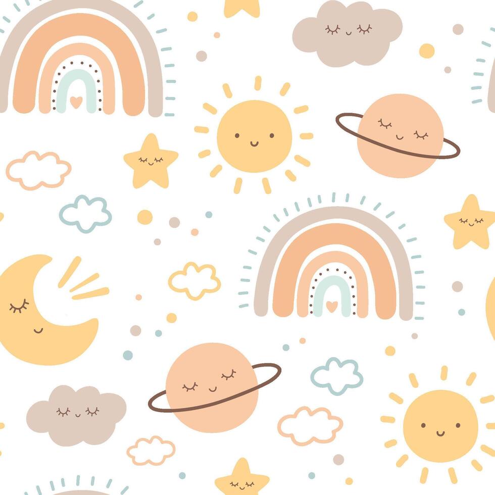 Bohemian baby pattern on white background. Seamless pattern in boho style with moon, sun and rainbow for textiles or fabric for newborns Pro Vector