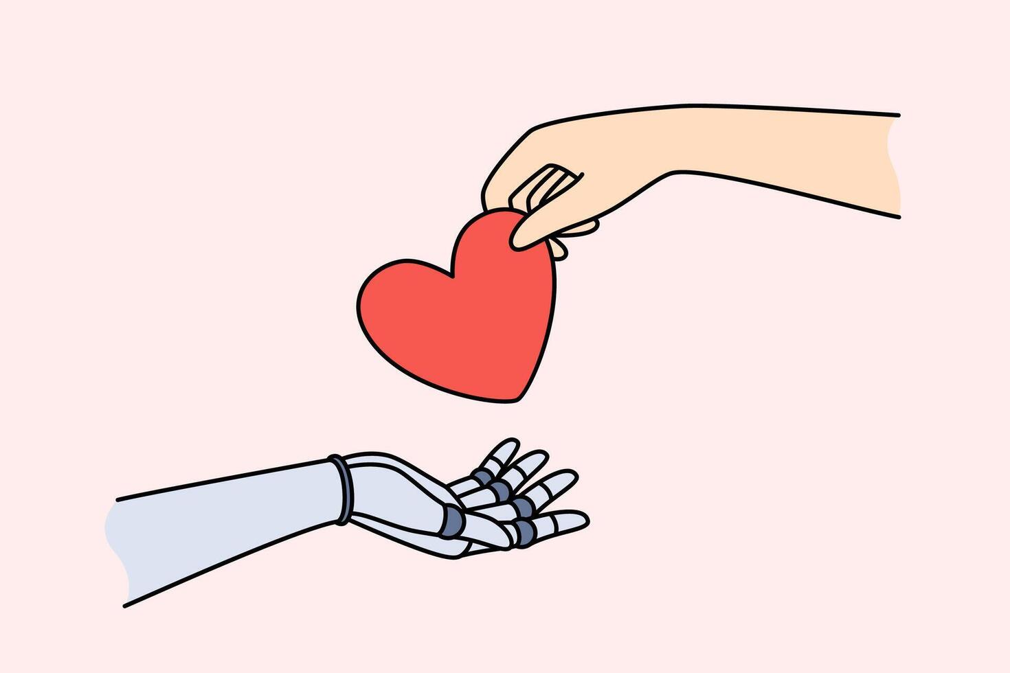 Collaboration of man and artificial intelligence is demonstrated by hands exchanging heart Pro Vector