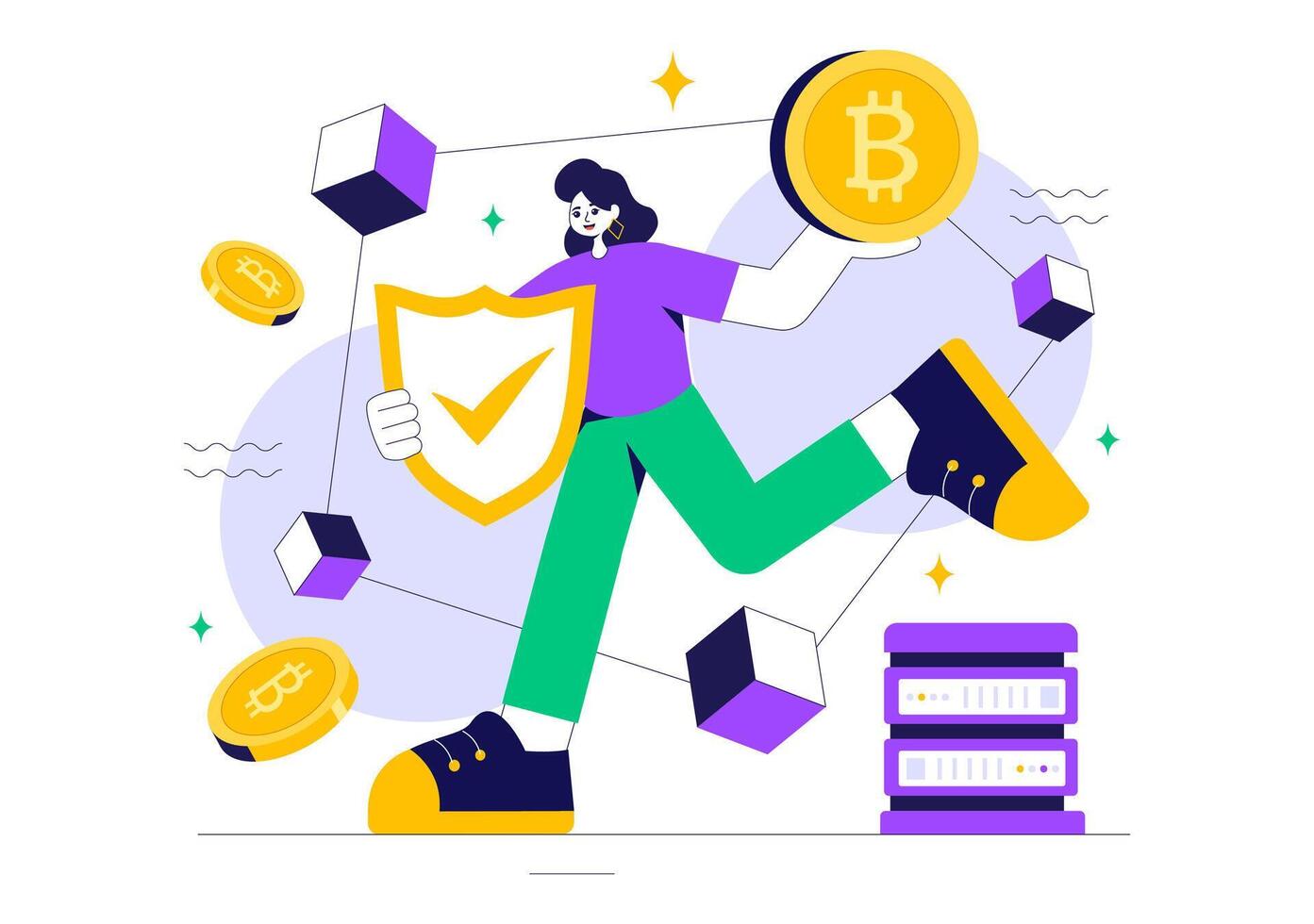 Crypto and Blockchain Illustration with AI Integration and Computer Work Pro Vector