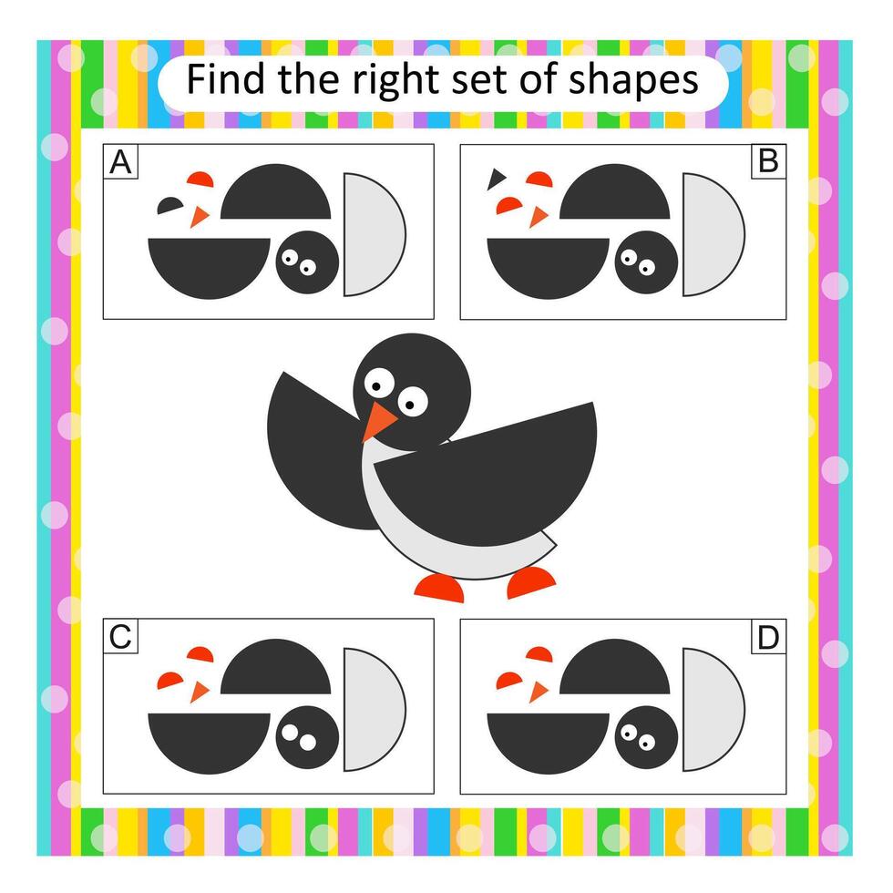Logic puzzle for children. Find the correct set of cartoon penguin. Answer is D. Pro Vector