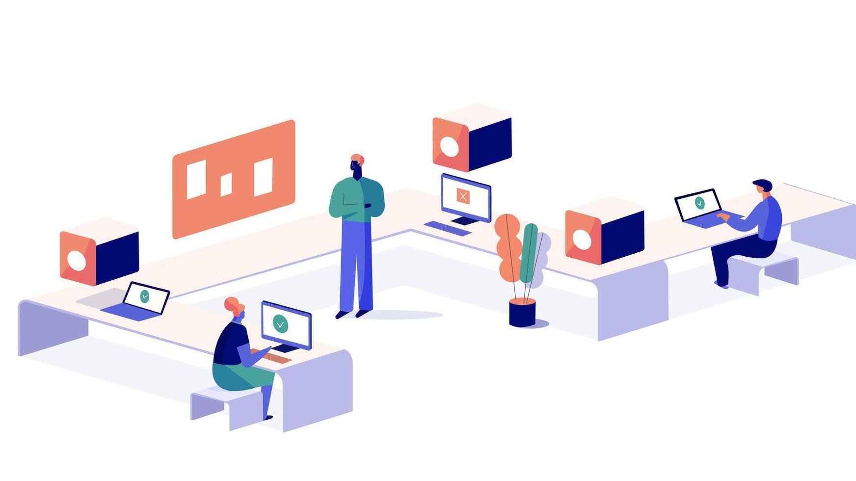 Collaborative Workspace with Professionals Testing and Reviewing Software in Flat Style Pro Vector