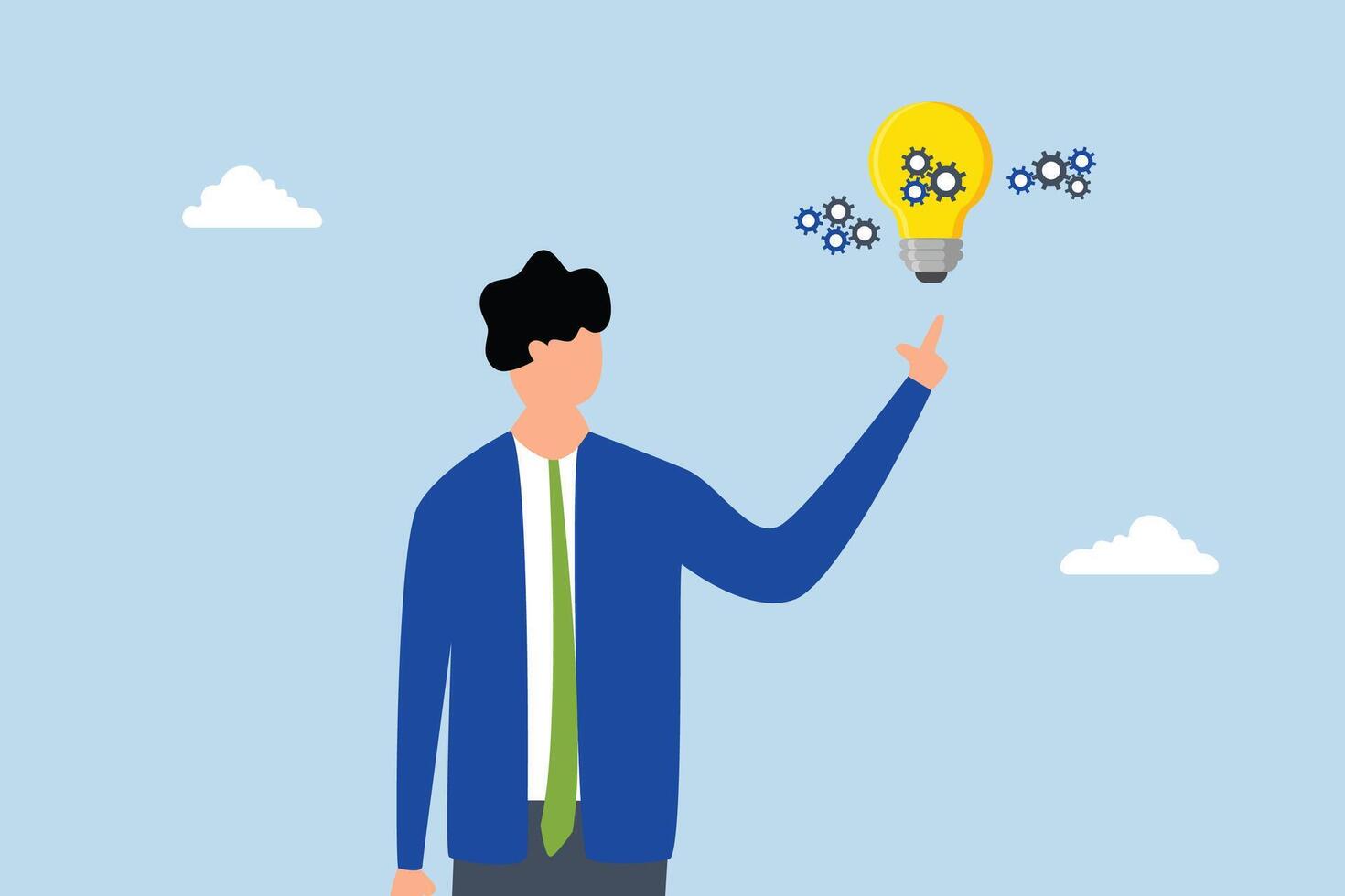 Innovation idea, businessman showcasing a novel lightbulb featuring cogs and gears to create new technology aimed at resolving business challenges. Pro Vector