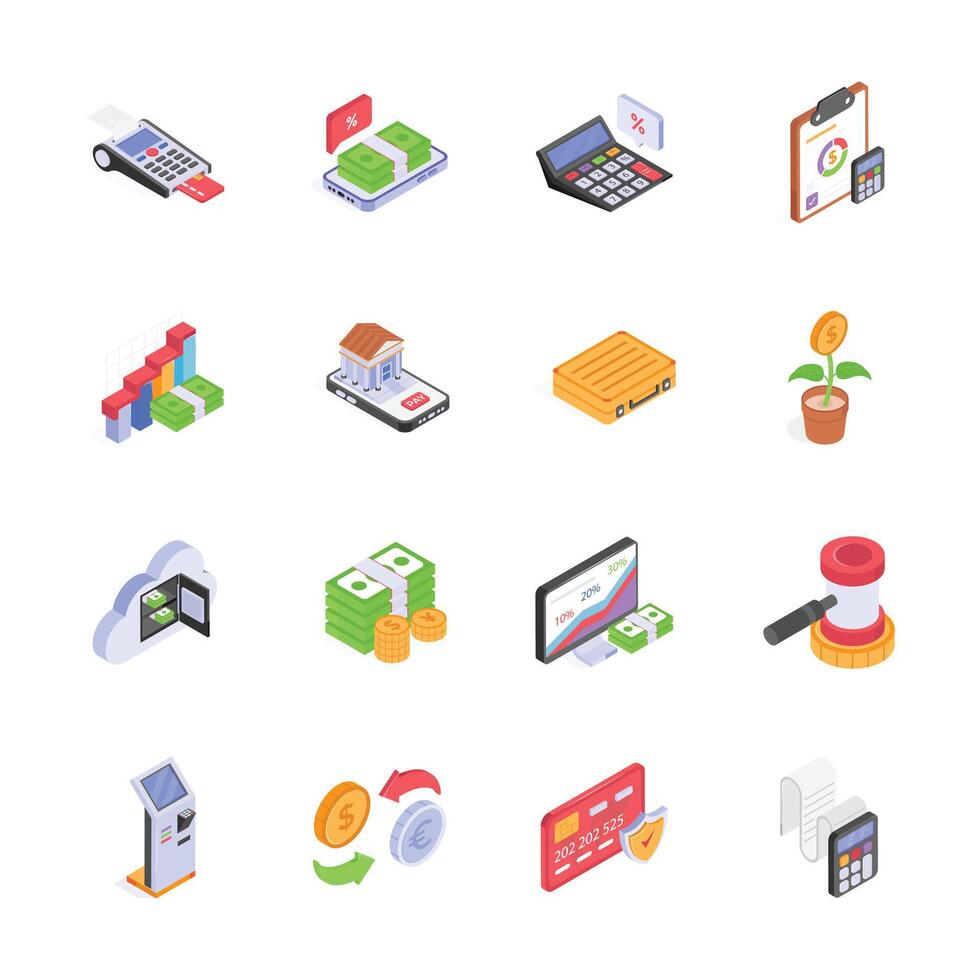 This image set features a collection of isometric icons, depicting diverse financial and business concepts Pro Vector