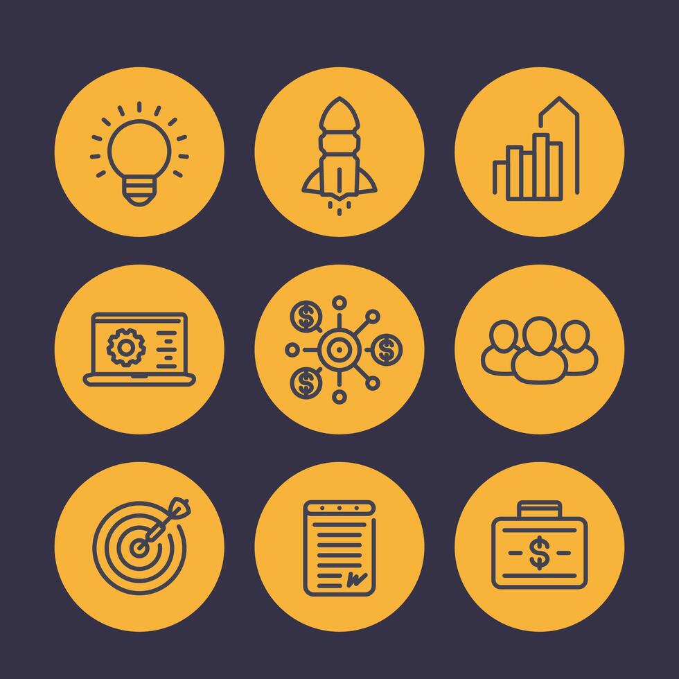 startup icons in linear style, product launch, development, funding, initial capital, contract, team, target market, customers Pro Vector