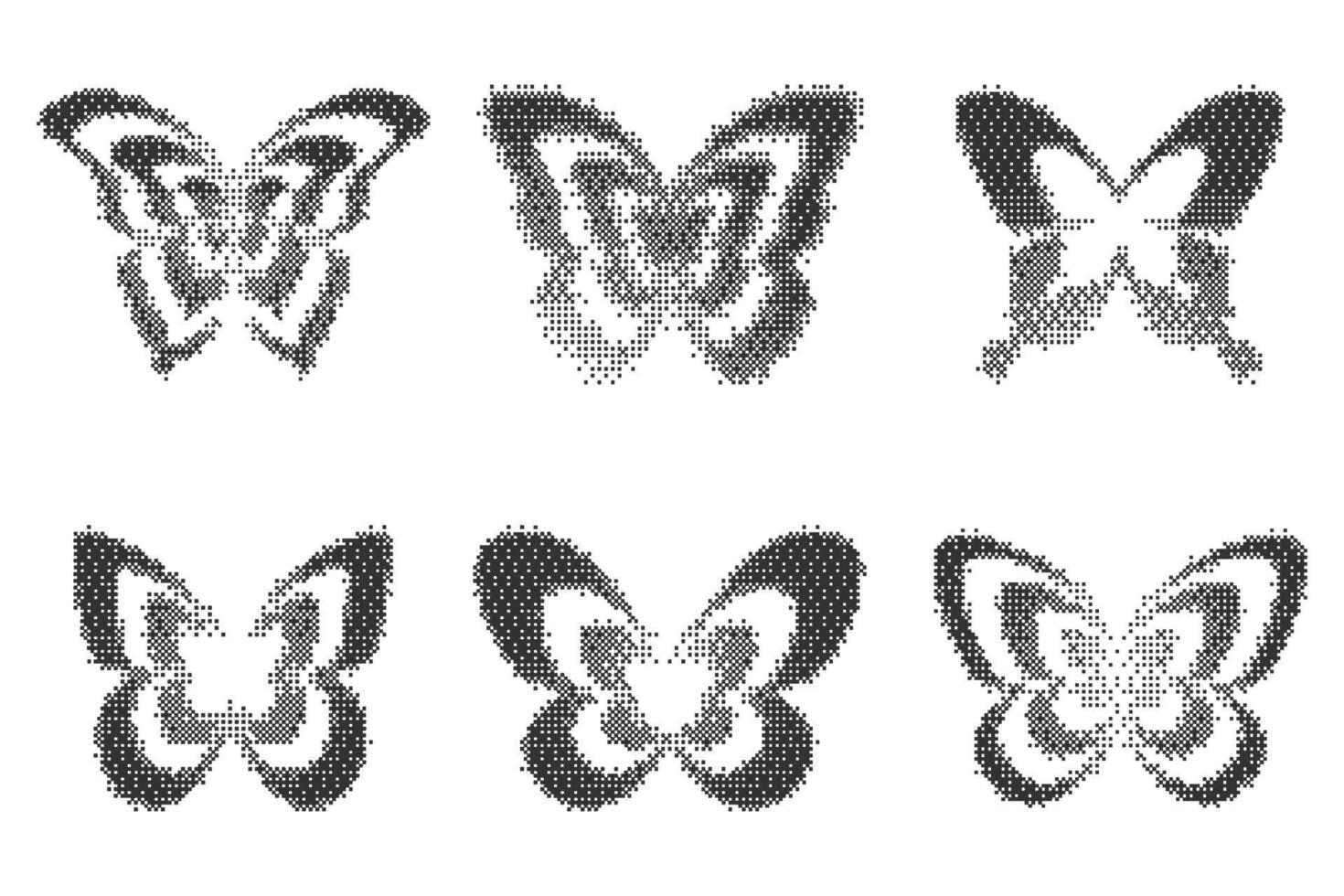 Bitmap pattern abstract butterfly shapes. Halftone gradient elements on white background. Y2k graphic abstract icons. Dither noisy grunge texture. Dither symbol Pro Vector