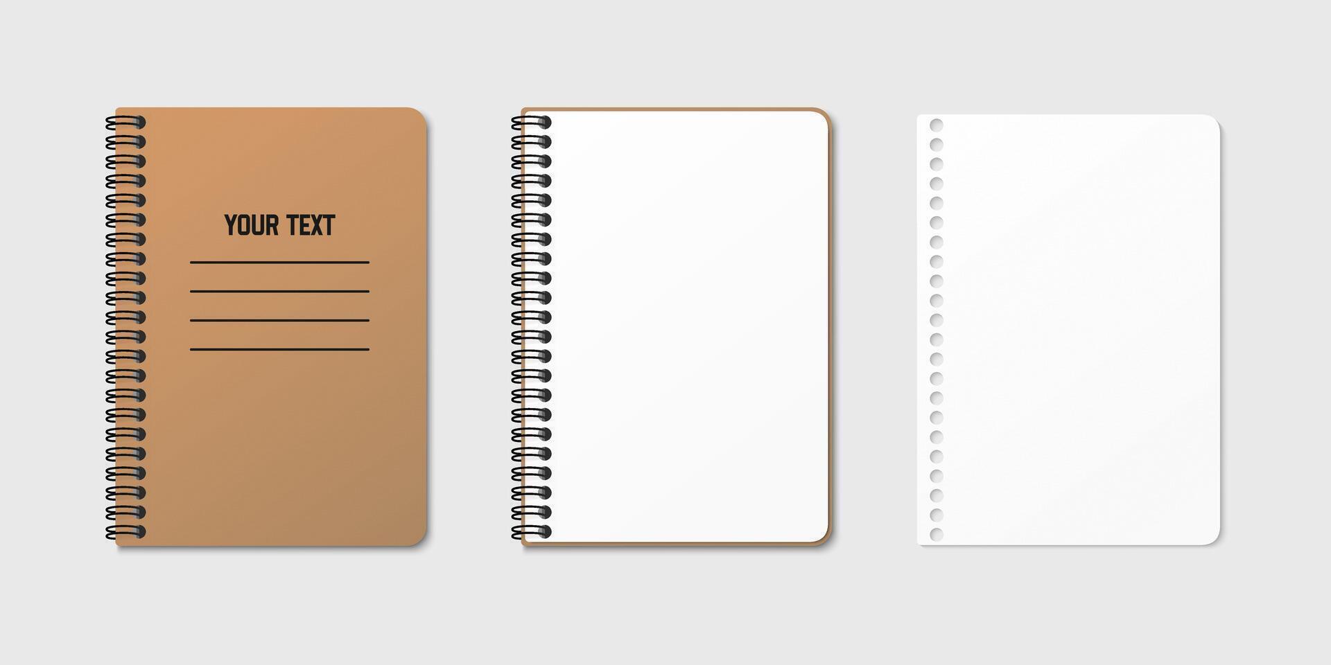 Vertical spiral spring notepad with space for your image or text on gray isolated background in three variations. Clean empty sheet. Notebook clipart illustration. Top view Pro Vector