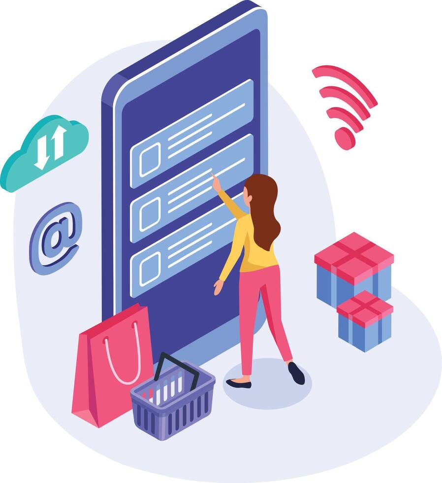 Online shopping concept showing a woman selecting items on a checklist displayed on a large smartphone, with shopping icons and gift boxes symbolizing e commerce and purchase Pro Vector