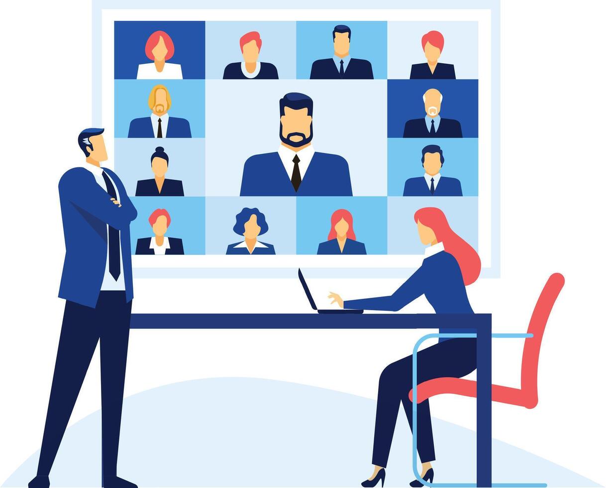 Business colleagues attending an online meeting via conference, using a laptop to connect with remote participants and discuss business matters Pro Vector