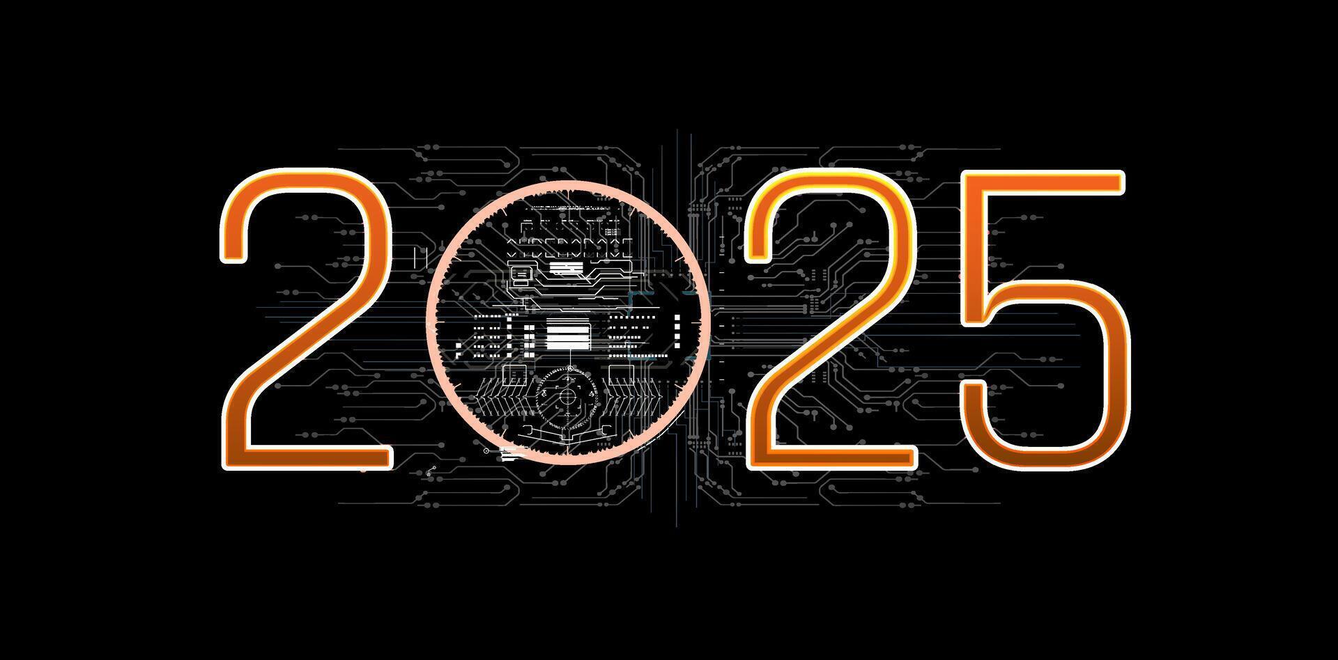 Modern digital design showcasing the year 2025 with circuit patterns and futuristic elements. Pro Vector