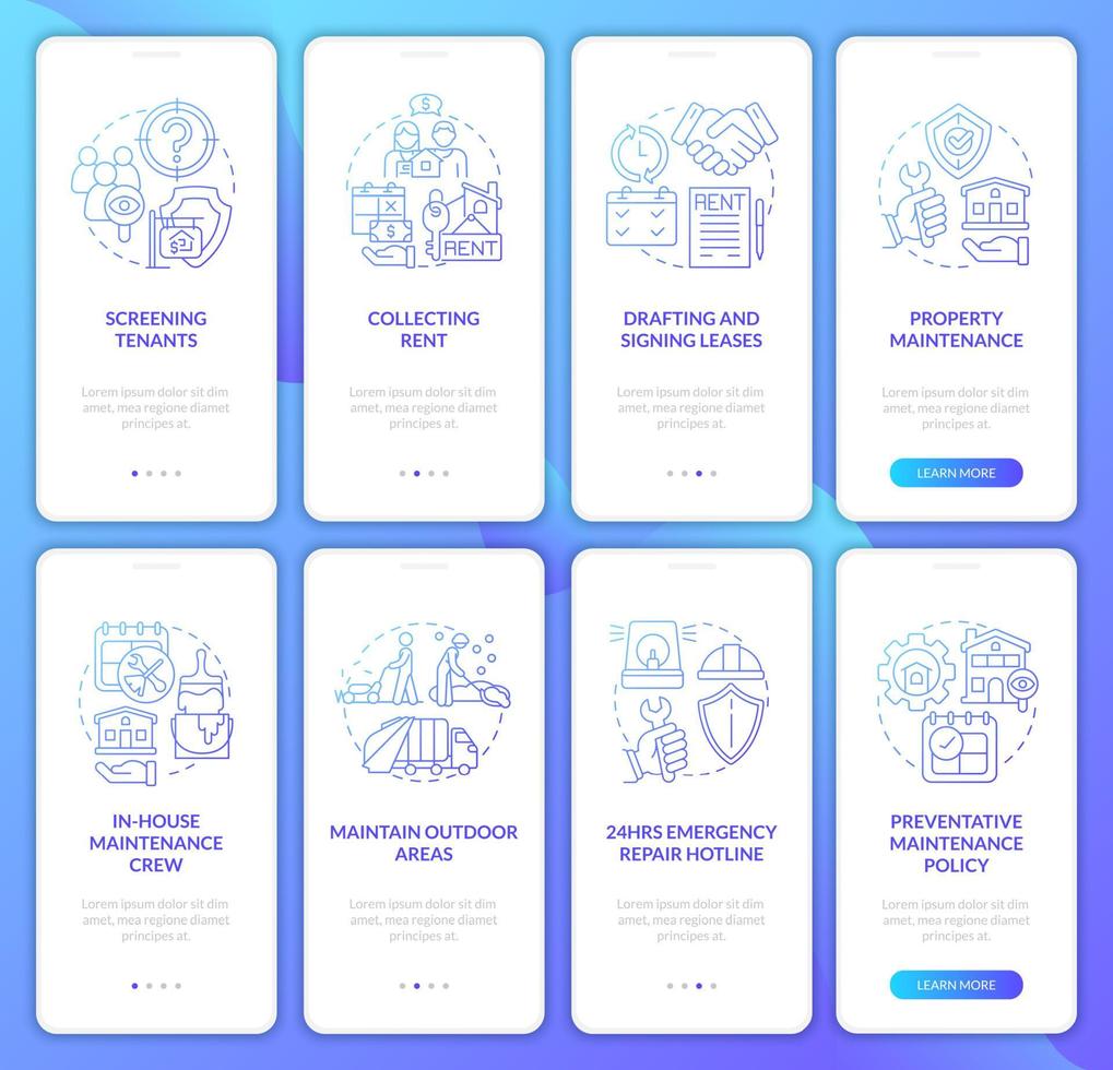 Property agency blue gradient onboarding mobile app screen set. Realty walkthrough 4 steps graphic instructions pages with linear concepts. UI, UX, GUI template. Myriad Pro-Bold, Regular fonts used Pro Vector