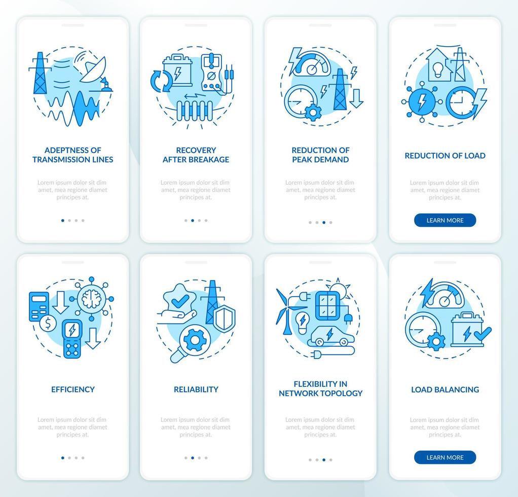 Smart grid blue onboarding mobile app screen set. Electric energy walkthrough 4 steps graphic instructions pages with linear concepts. UI, UX, GUI template. Myriad Pro-Bold, Regular fonts used Pro Vector
