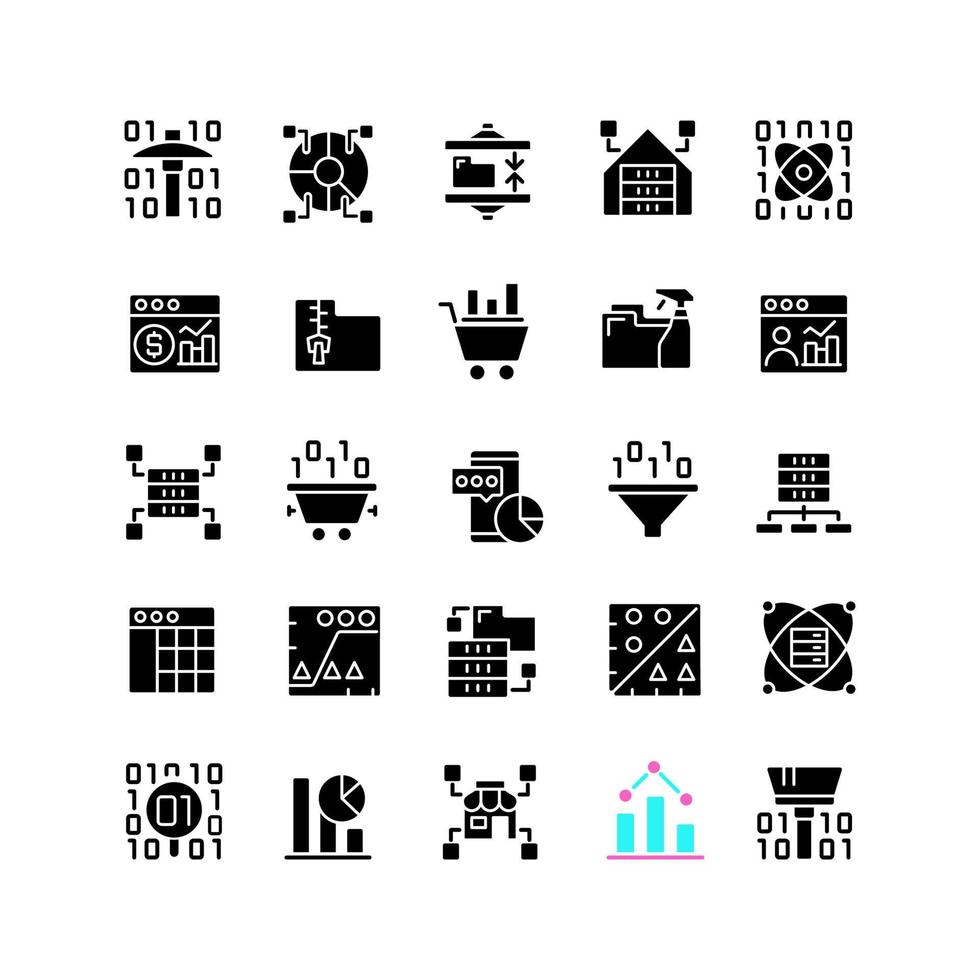 Data mining black glyph icons set on white space. Knowledge discovering in data. Analyze and storage information. Science and technology. Silhouette symbols. Vector isolated illustration Pro Vector