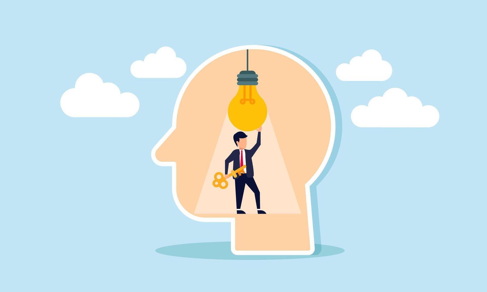 A businessman holds a key inside a head shape while fixing a lamp, illustration of maintaining ideas and innovation to provide new solutions for business challenges Pro Vector