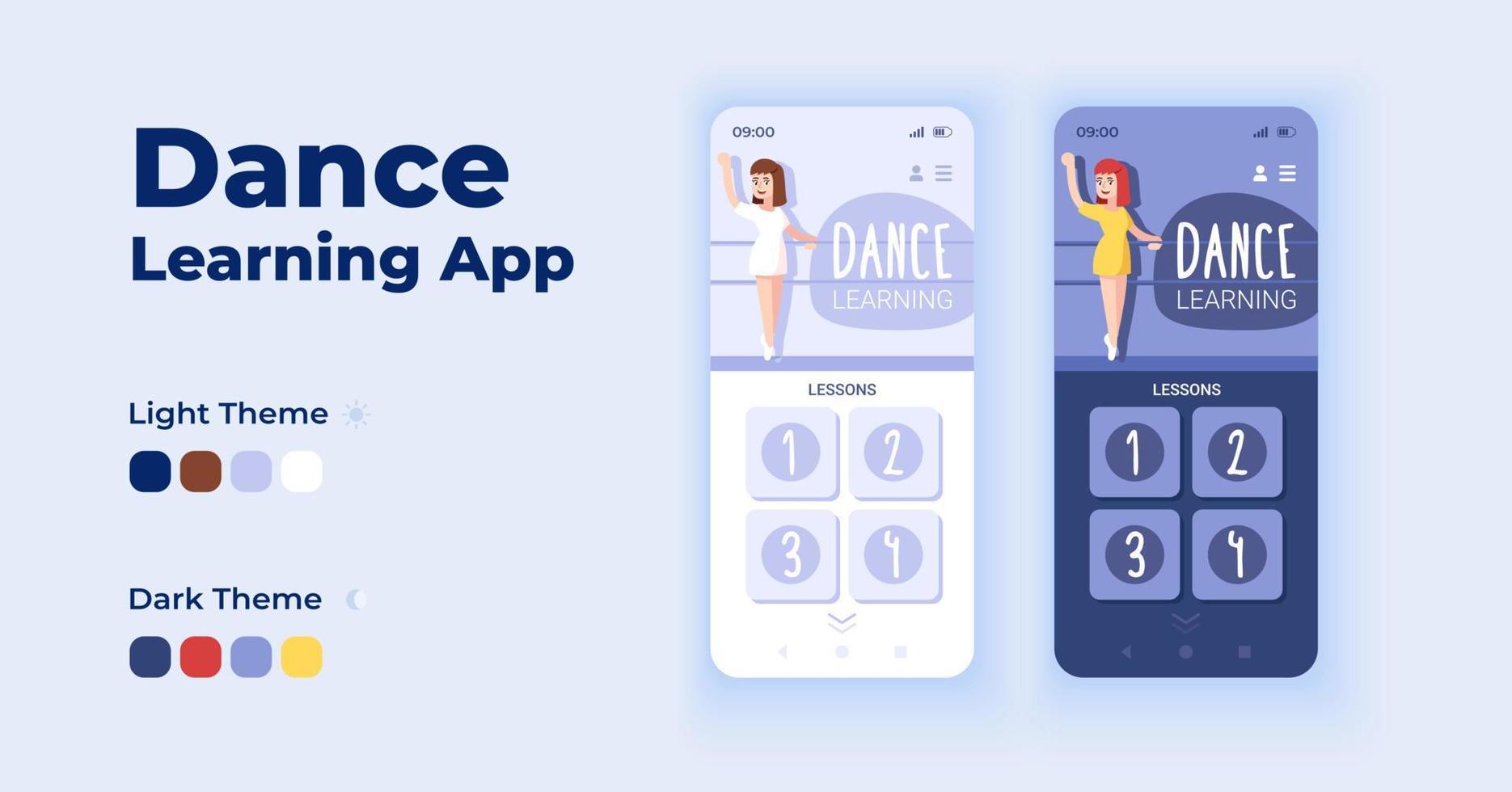 Dance learning app cartoon smartphone interface vector templates set. Mobile app screen page day and dark mode design. Online dance classes UI for application. Phone display with flat character Pro Vector
