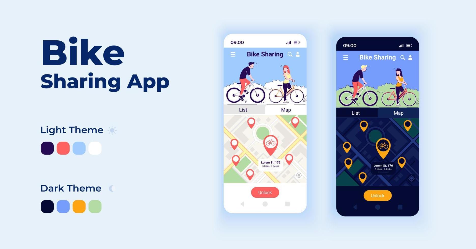Bike sharing app cartoon smartphone interface vector templates set. Mobile app screen page day and dark mode design. Bicycle sharing platform UI for application. Phone display with flat character Pro Vector