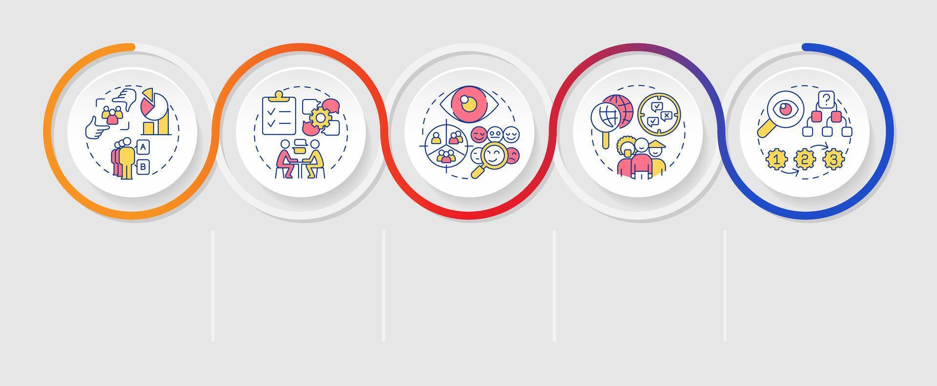 Different market research methodologies infographics circles sequence. Case study, marketing. Visualization layout with 5 steps. Info chart loop process presentation Pro Vector