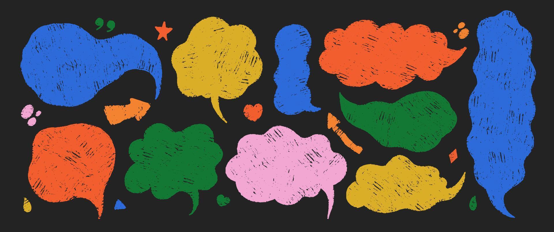 Set of text boxes and speech bubbles with crayon or chalk texture. Retro illustration on a black background. Pro Vector