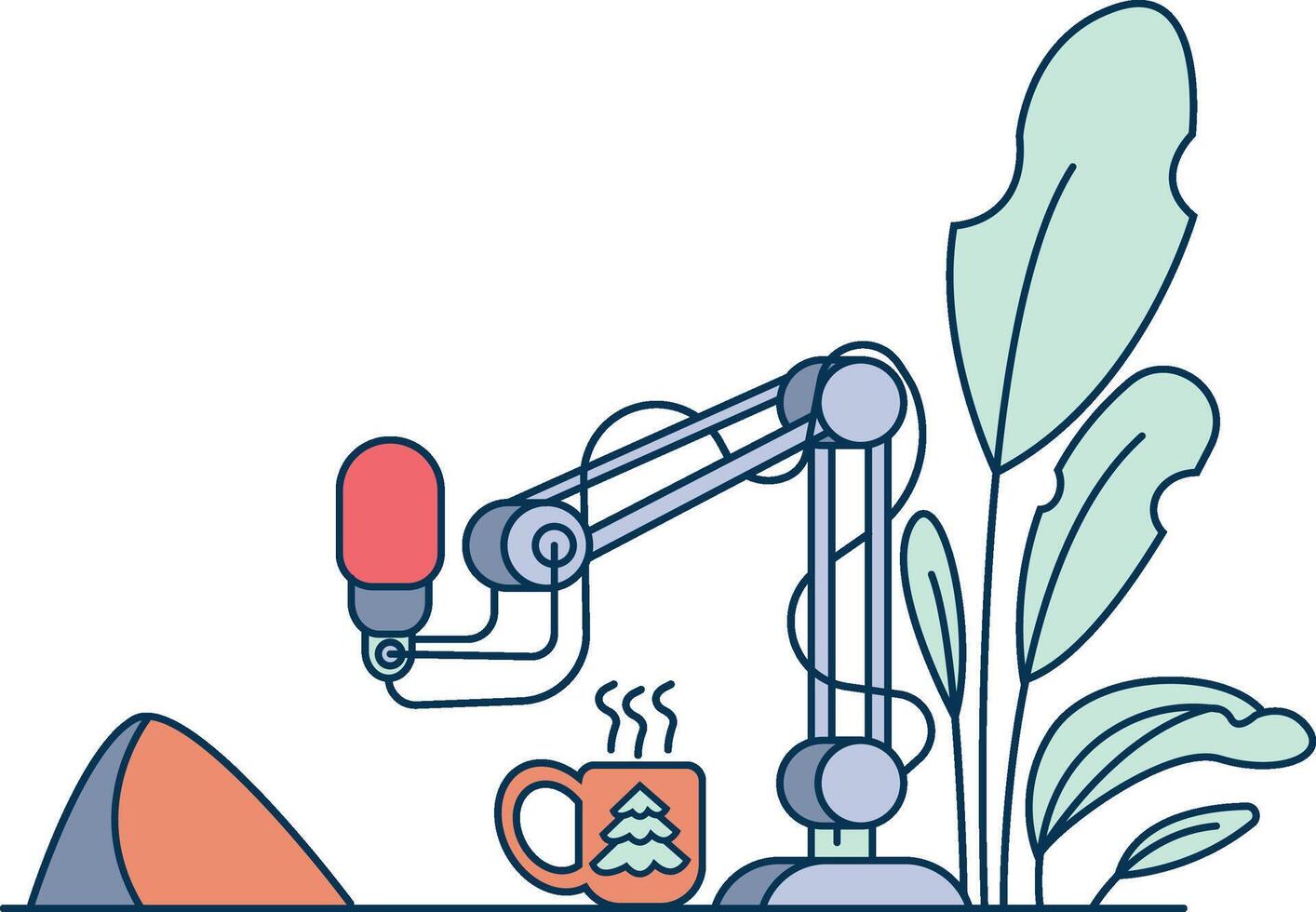 A microphone is on a table next to a mug with a tree on it Pro Vector