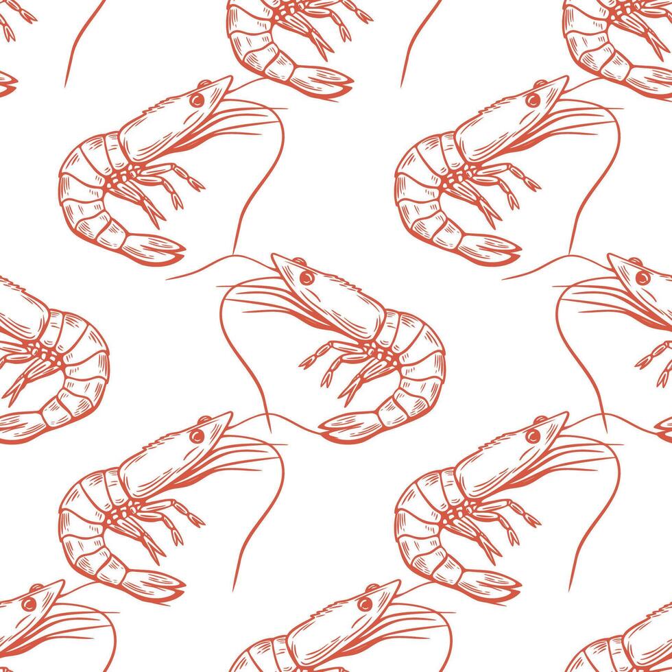 Seamless pattern, shrimp, line pattern, red on white background. Packaging, wrapping, background. Pro Vector