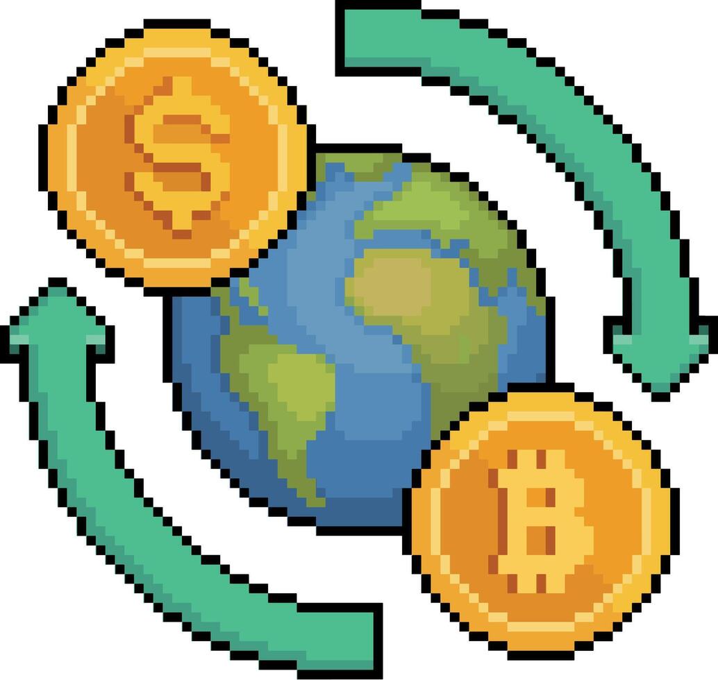 Pixel art of earth globe with dollar and bitcoin coin with green arrows around in 8-bit style Pro Vector