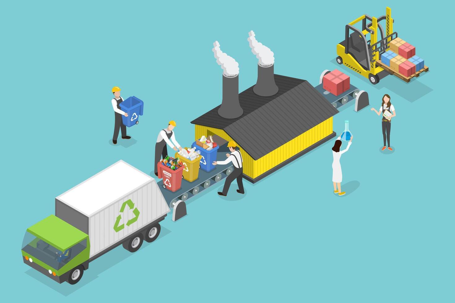 3D Isometric Flat Conceptual Illustration of Recycling Factory Pro Vector